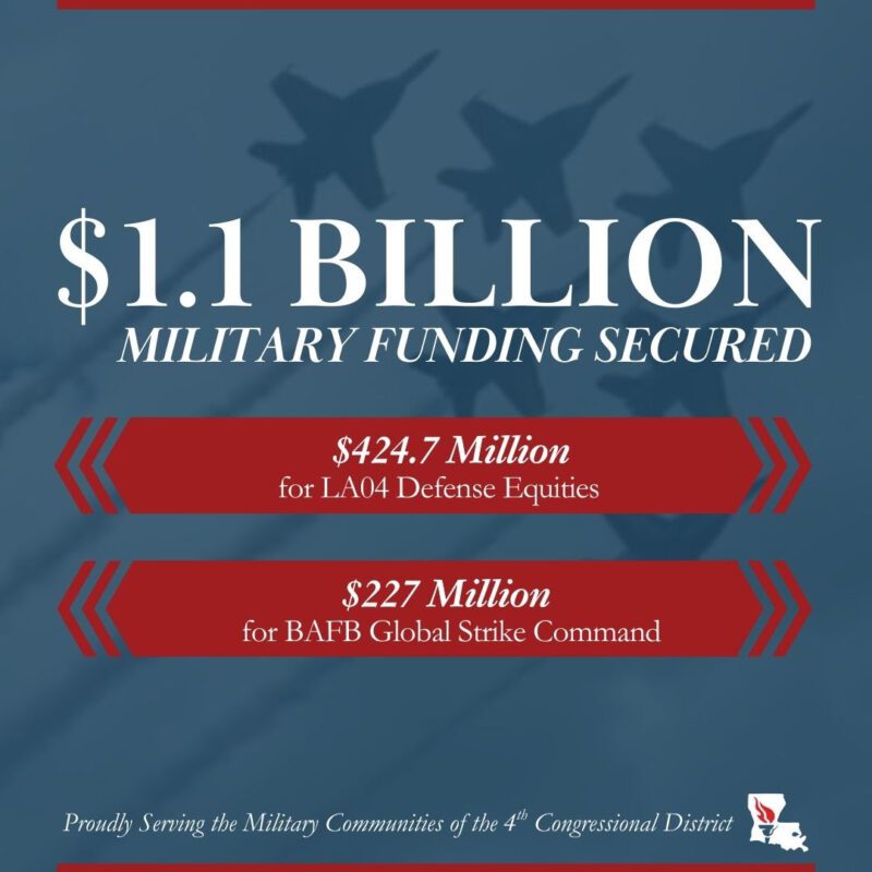 424,7 milijuna USD za obrambene dionice u Četvrtom kongresnom okrugu Louisiane, uključujući: o 227 milijuna USD za Barksdale Air Force Base Global Strike Command (AFGSC) za poboljšanje spremnosti i infrastrukture. o 111,2 milijuna USD za sigurnosne i trening misije AFGSC-a. o 115,8 milijuna USD za jačanje partnerstava između AFGSC-a i obrambenog sektora Shreveport-Bossier. 40 milijuna USD za podršku obrambenoj industriji u Camp Mindenu u Winnfieldu, vitalnom centru vojne logistike i obuke. 11,5 milijuna dolara za novi program suradnje u Fort Polku, usmjeren na rješavanje problema s kojima se suočavaju vojnici i poboljšanje njihove kvalitete života. 20 milijuna dolara za Program vojnog-civilnog medicinskog jačanja, osiguravajući pristup zdravstvenoj zaštiti za članove službe tijekom izvanrednih situacija. Snažno financiranje za Ministarstvo pomoći zbog posljedica rata, koje podržava škole u zajednicama s velikim brojem vojnika poput Vernon Parisha — osiguravajući da lokalni učenici uspijevaju unatoč izazovima vojnog života.