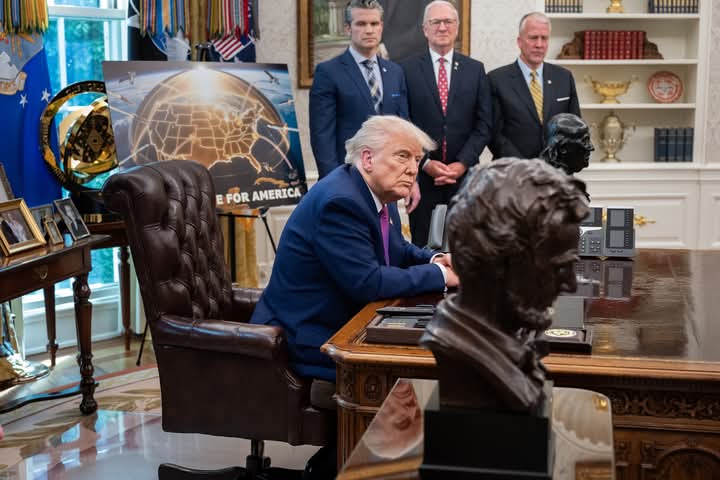 President Donald Trump speaks with officials and staff in the Oval Office before his announcement of the Golden Dome missile defense system, Tuesday, May 20, 2025. (Official White House Photo by Joyce N. Boghosian)