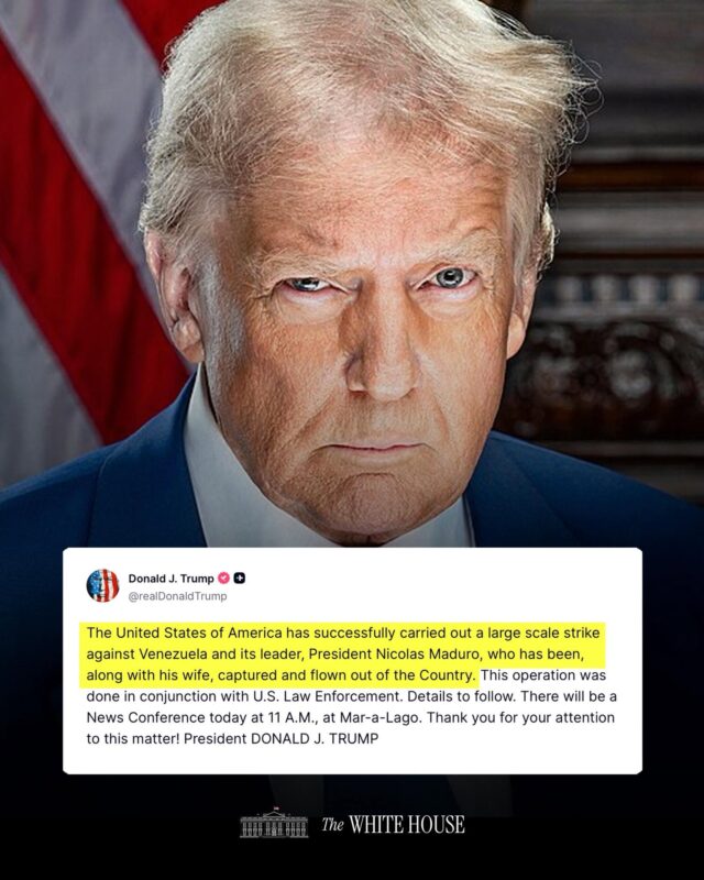 "The United States of America has successfully carried out a large scale strike against Venezuela and its leader, President Nicolas Maduro, who has been, along with his wife, captured and flown out of the Country. This operation was done in conjunction with U.S. Law Enforcement.… pic.twitter.com/sFa5OC4ZrZ